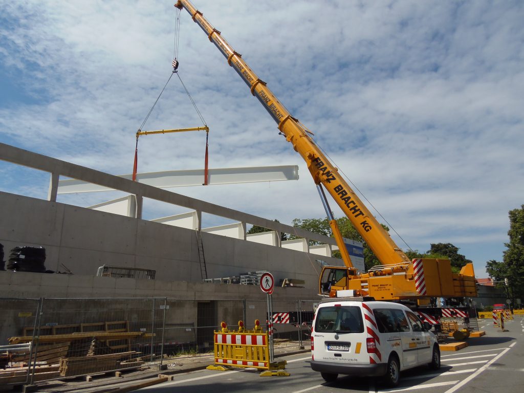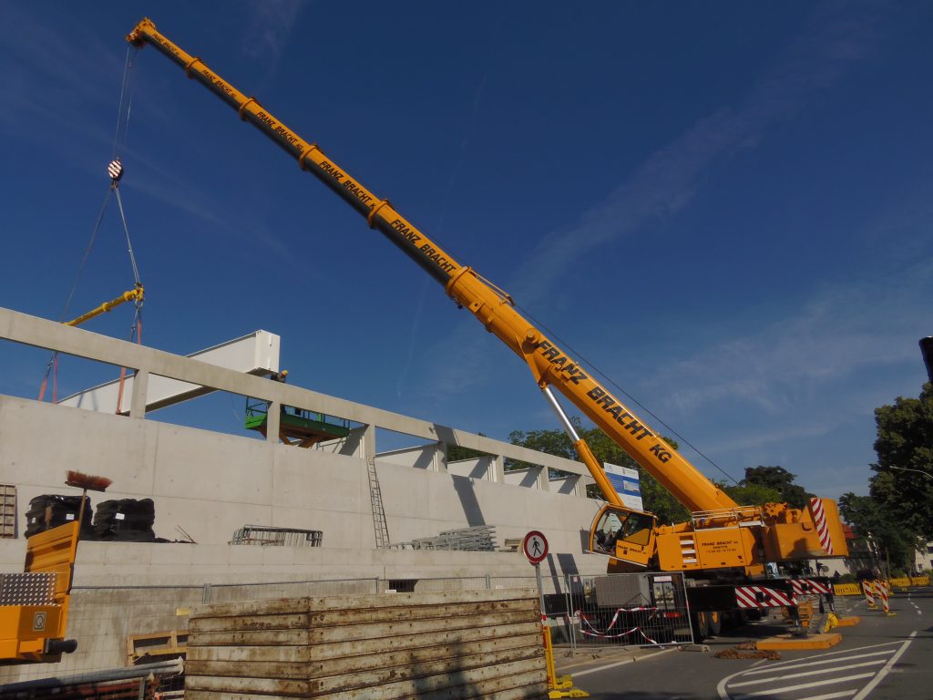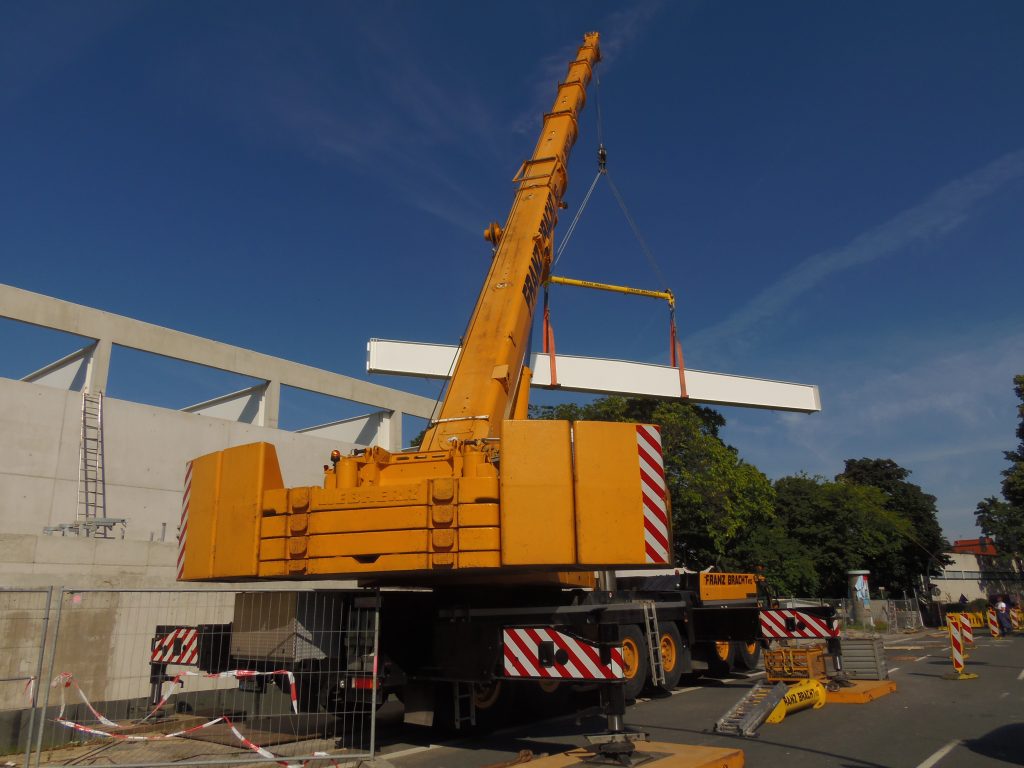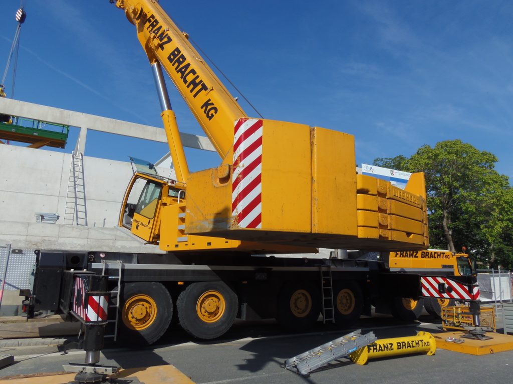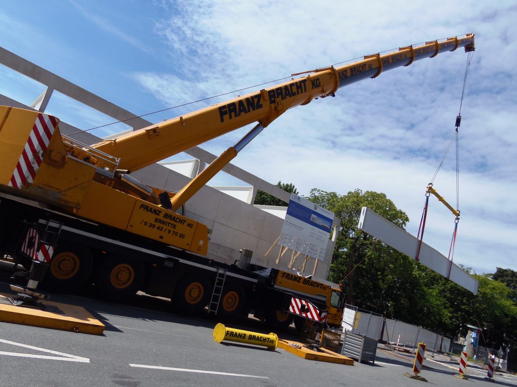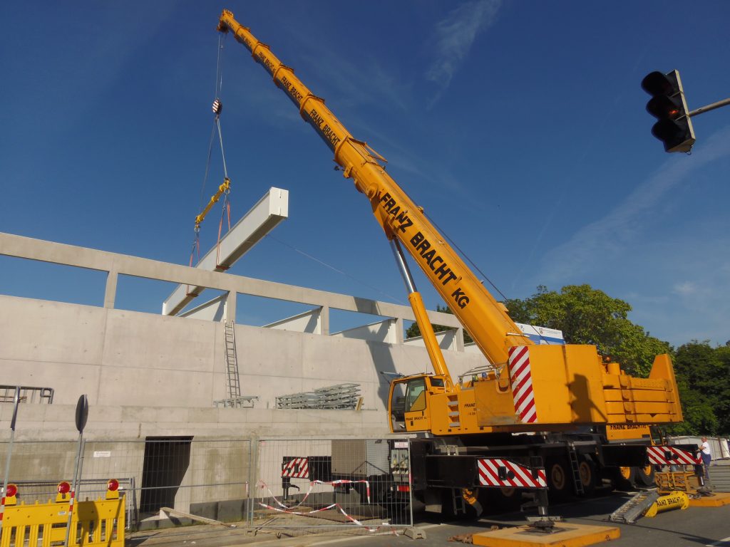 Ein Liebherr-Kran LTM 1250-6.1 der Firma Franz Bracht beim einheben von Trägerbalken.