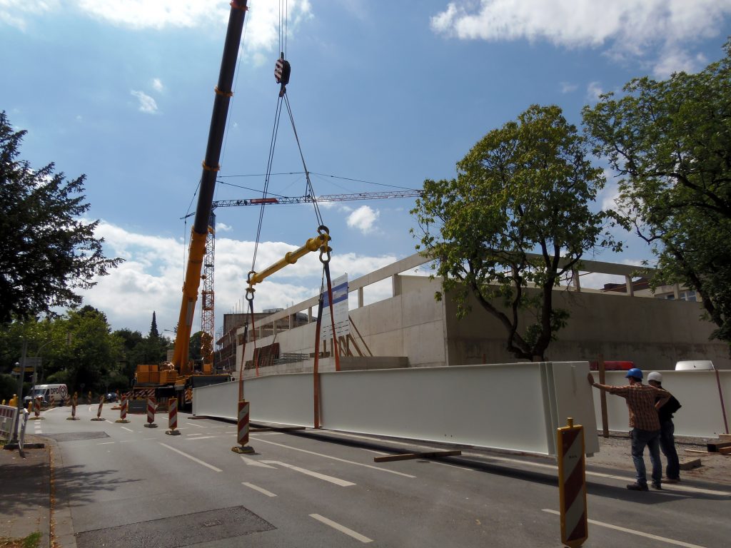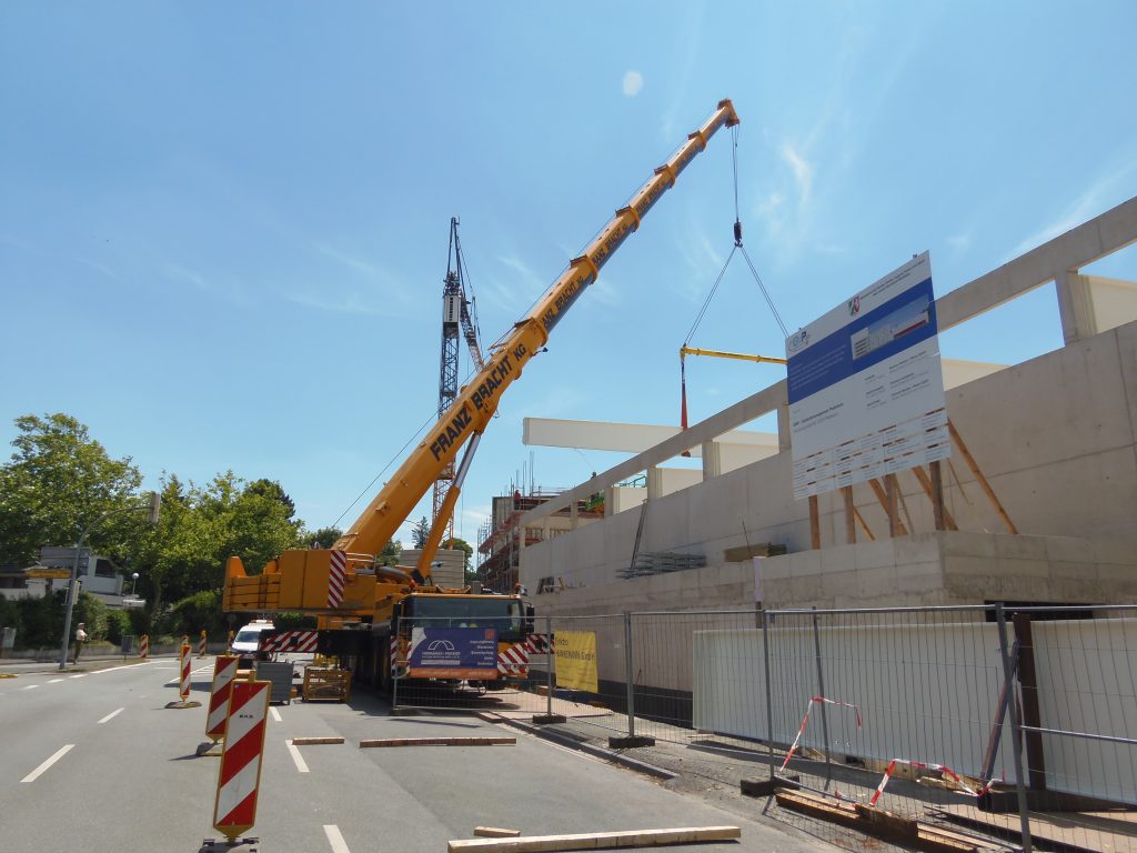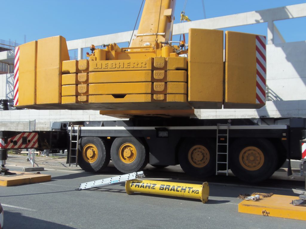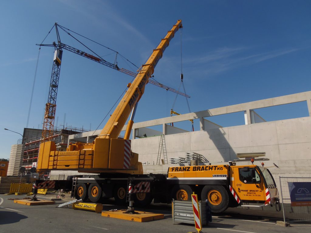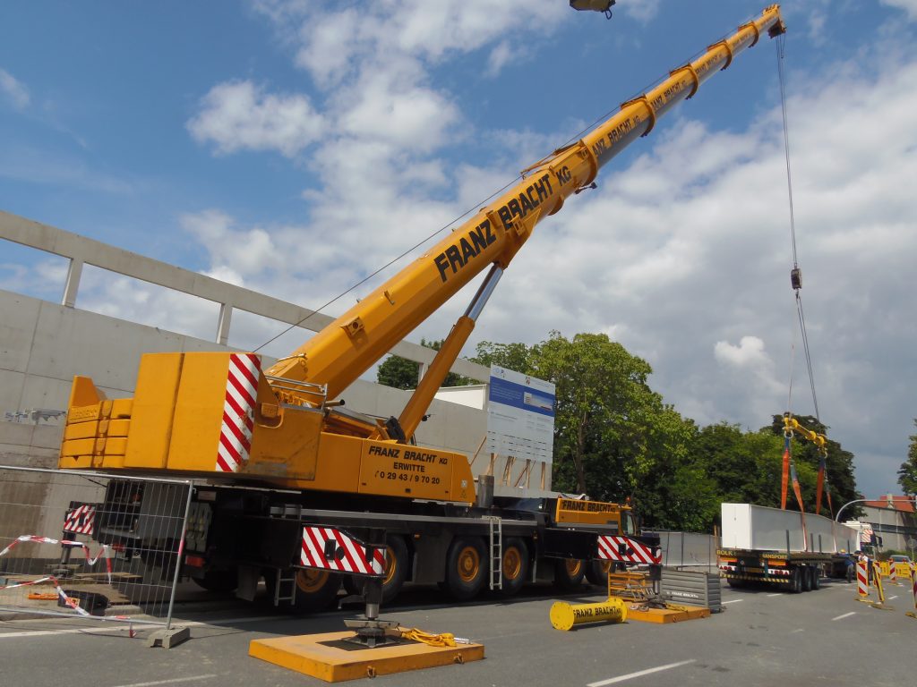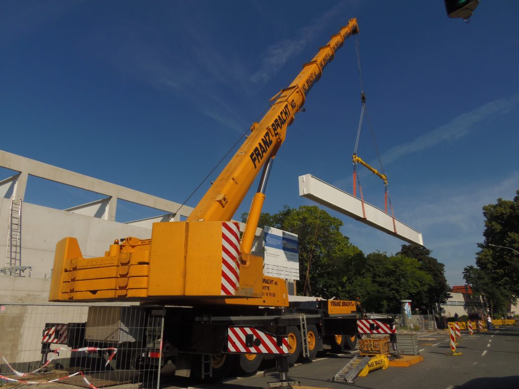 Ein Liebherr-Kran LTM 1250-6.1 der Firma Franz Bracht beim einheben von Trägerbalken.